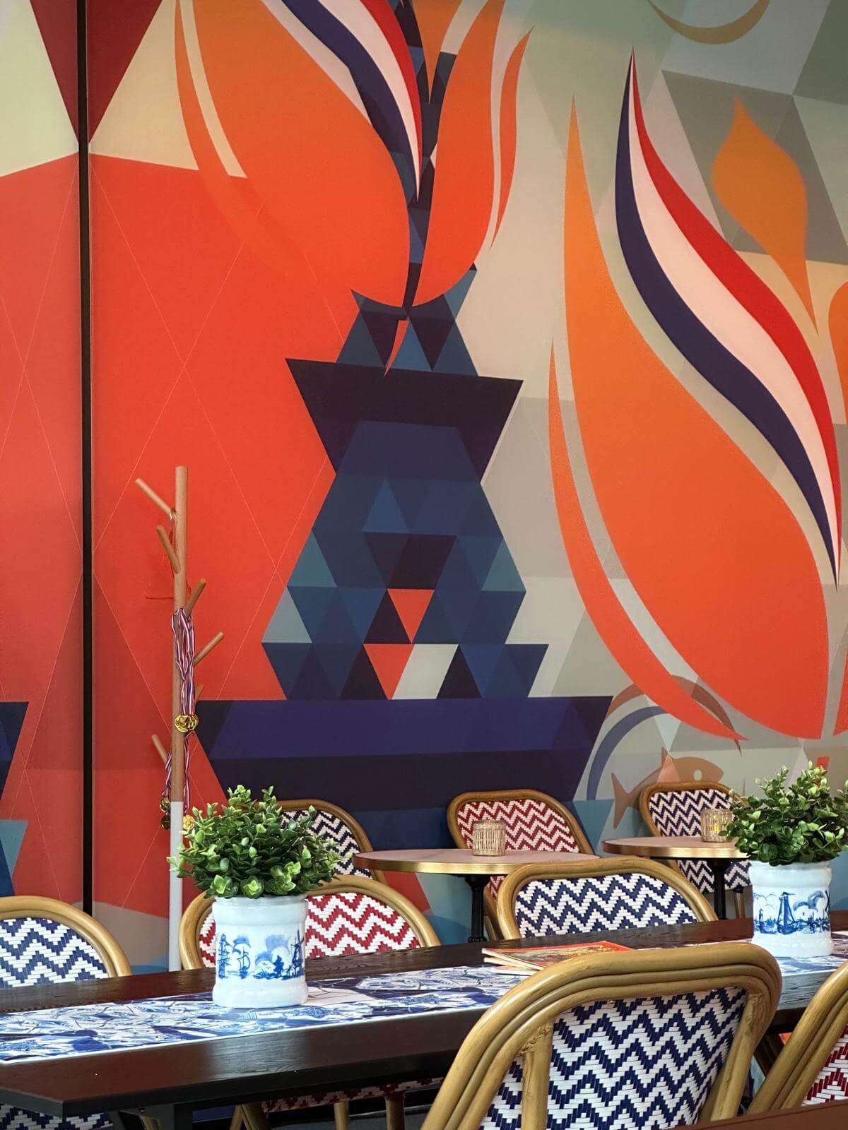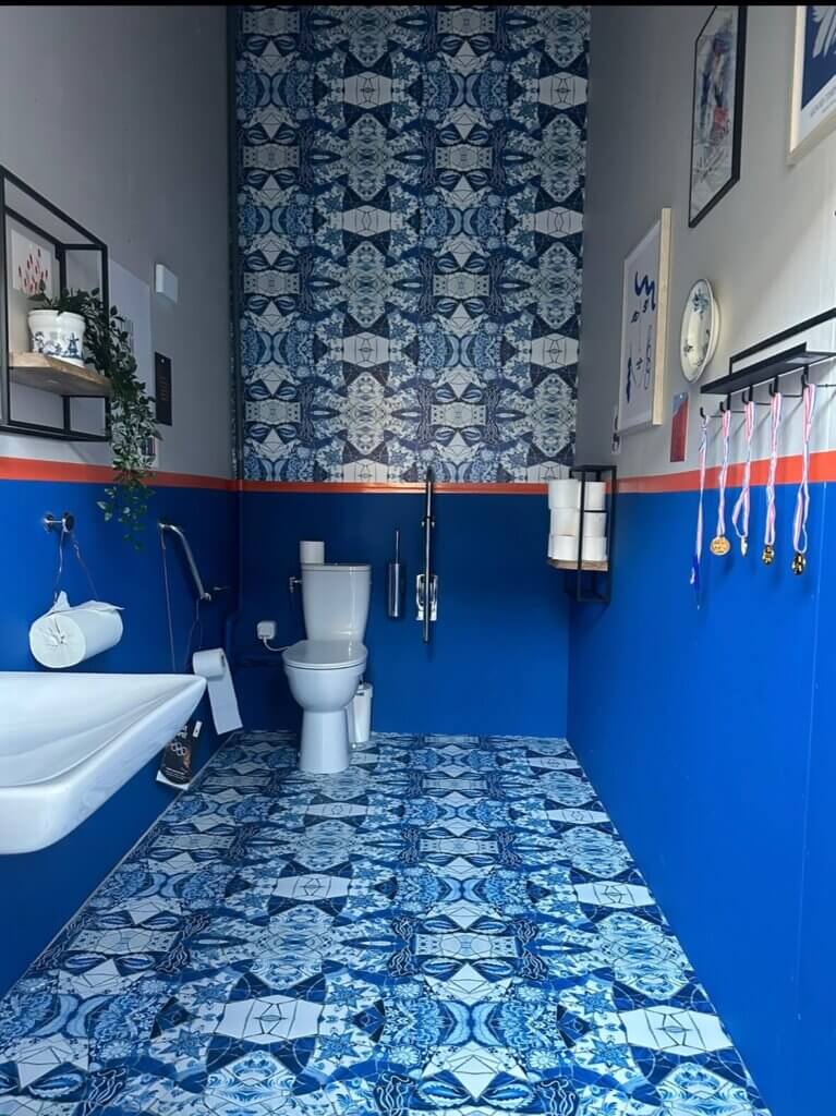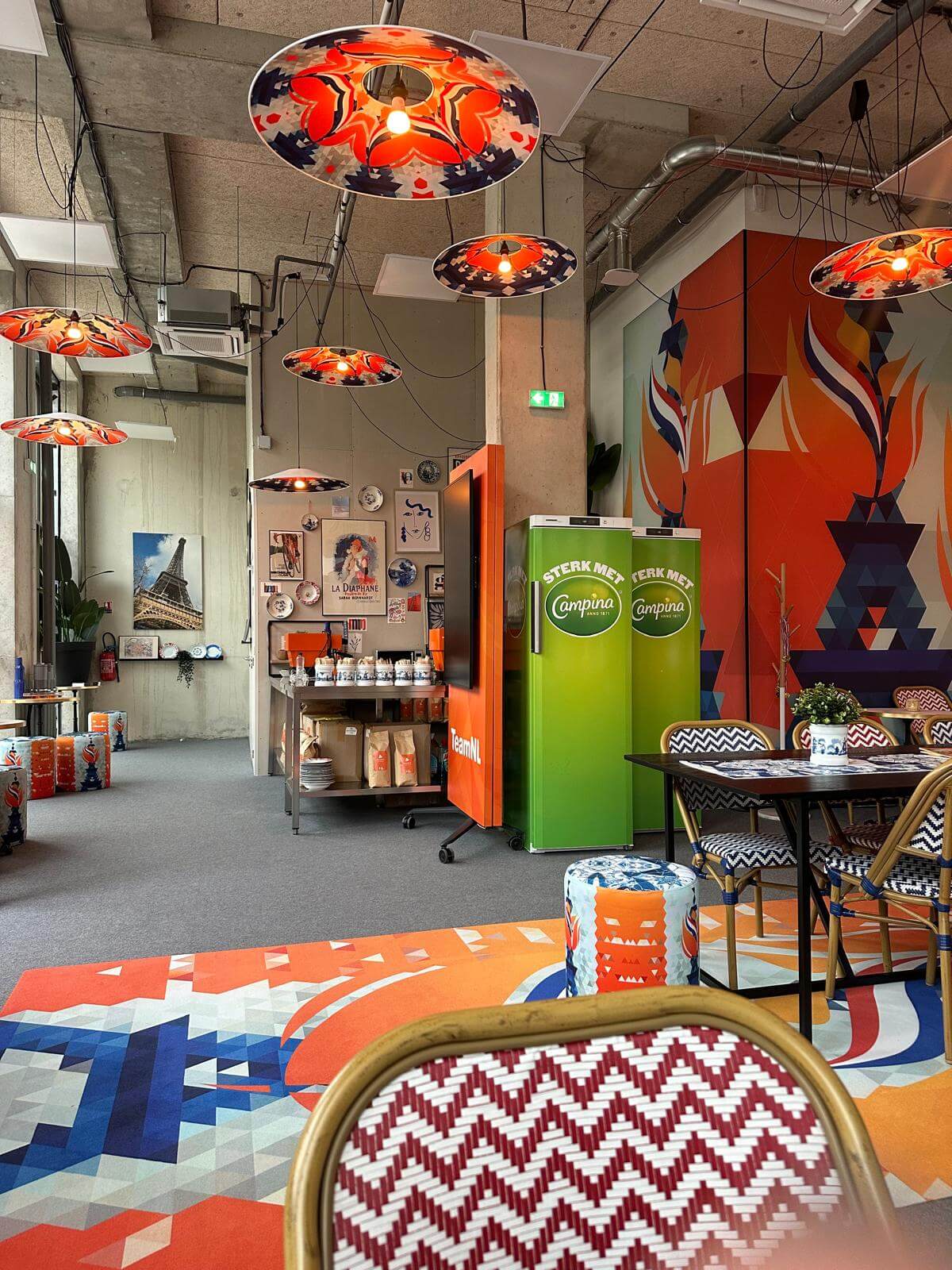 Omdat de Olympische Spelen in Parijs plaatsvonden, is in het beeldmateriaal gekozen voor een unieke combinatie van de Eiffeltoren en het Team NL-logo. Dit ontwerp is op uiteenlopende manieren doorvertaald en toegepast in het interieur — van lampenkappen en poefjes tot het vloerkleed.